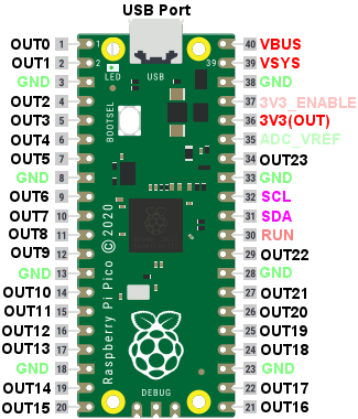 OUT0 | Output port #0 (GP0 on the standard Pico pin-out diagram) |