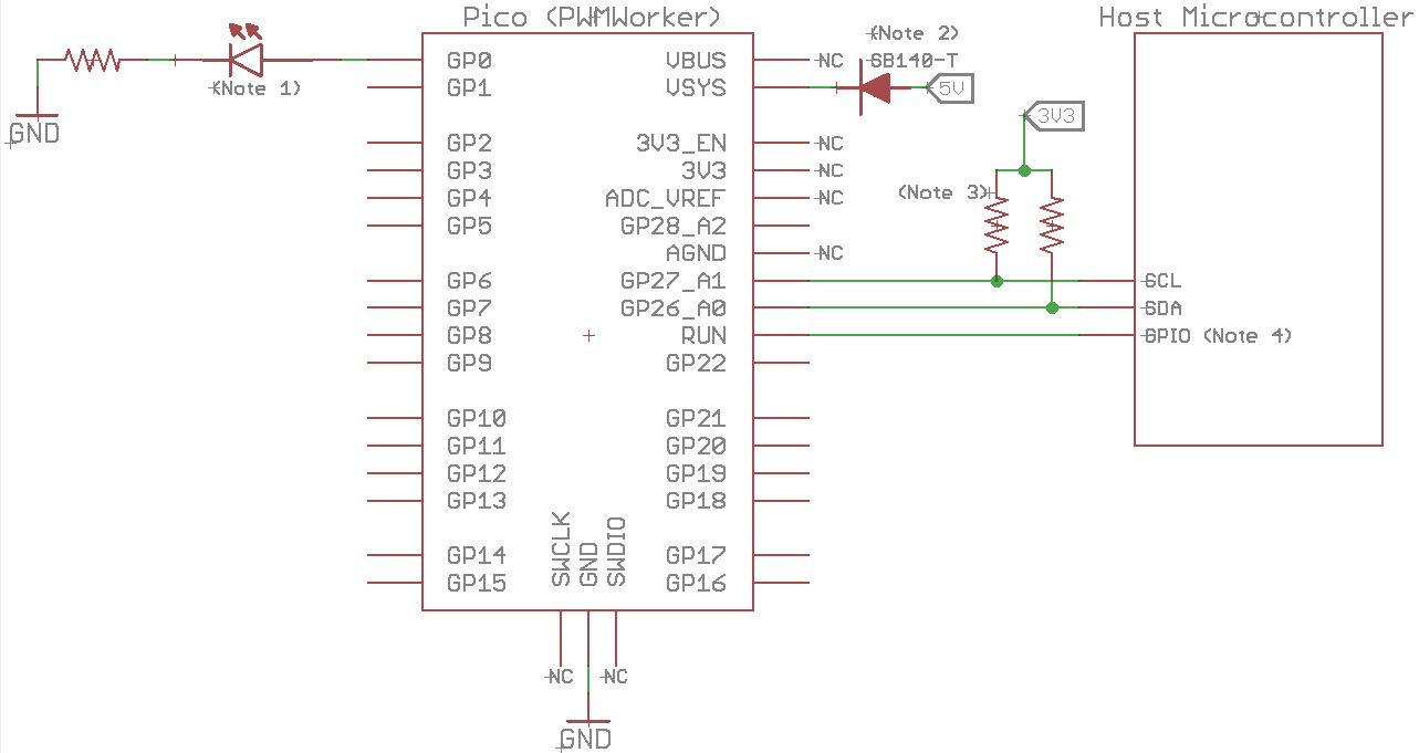 This data sheet documents the Pico PWMWorker system from the perspective of a hardware designer who wishes to use the device as part of a circuit board, in place of one of the more conventional PWM controller chips. It describes how to wire the Pico into your circuit board at the hardware level, and how to access the I2C interface to control the device from your main I/O controller's software. PWMWorker's I2C command set is very similar (intentionally) to the interfaces exposed by most of the commercial PWM controller chips (which are mostly very similar to one another), with the goal of making it relatively easy to adapt a host-side software driver that you've already created for one of those other chips to this new "chip". This design doesn't attempt to be a drop-in replacement for any specific commercial chip, but it's meant to be similar enough to those chips in its conventions that it's a low-effort substitute.