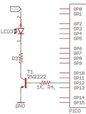 The output wiring is shown for a simple LED with high-side control, but this can be replaced with any circuit that can be driven by a Pico GPIO output. Pico outputs can drive up to about 10mA at 3.3V directly, and can drive almost any type of load with a suitable amplifier/booster circuit. Several example circuits that can drive higher-current devices are shown in the section below. Each output driver is independent, so you can freely mix and match driver types across the various outputs.