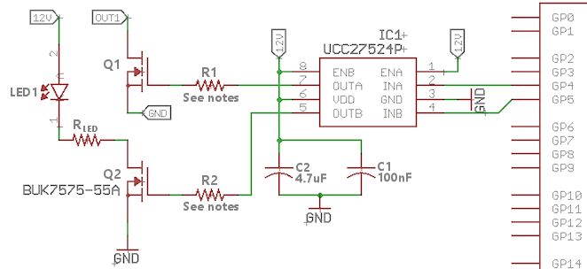 For really high-power devices, like solenoids and motors, you need a MOSFET, specifically a large "power" MOSFET. Many power MOSFETs are available that can switch 10A and up, at 50V or more, which makes the MOSFET the device of choice for controlling anything larger than an LED from a microcontroller. But MOSFETs are somewhat more challenging to control than NPNs and Darlingtons, because most power MOSFETs are all by themselves high-power devices that are above the limits of a Pico GPIO port to control directly. In particular, most power MOSFETs require voltages well above 3.3V for their control input signal, and many also require higher current than a Pico GPIO port can provide, especially when operating at high PWM frequencies. So you need an amplifier to drive your amplifier! There are numerous ways to do this, but the easiest and best is to use one of the many special "gate driver" chips that are purpose-built for this application. One good example is UCC27524P. A circuit based on this chip is shown below. Using a gate driver like this makes the circuit much more forgiving about the MOSFET specs it requires, giving you more flexibility when choosing parts. The circuit here will work with most power MOSFETs, as long as they're safe to use with the 12V gate drive shown (check the VGS limit in the Absolute Maximum Ratings in the data sheet; most large power MOSFETs have a rating around 20V).