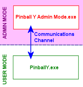 It's important to understand that PinballY Admin Mode.exe isn't just "PinballY running in Admin Mode". PinballY Admin Mode.exe is actually a separate, small program that only performs a few special functions that require Administrator mode privileges. When this is running, the regular PinballY.exe program - which contains the PinballY user interface and most of its other functions - runs in regular user mode. When the user-mode PinballY program needs to carry out some special operation that requires Administrator privileges, such as launching a game in Admin mode, it sends a request to the Admin Mode program via the communications channel telling the Admin Mode program to carry out the special operation.
