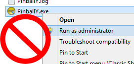 In contrast, when you use the "Run as Administrator" command in Windows Explorer to run PinballY.exe, you force the entire program and every program it launches to run in Admin mode. The entire PinballY Direct3D UI will run in Admin mode. Every Visual Pinball game it launches will run in Admin Mode. Every Future Pinball game, Pinball Arcade Game, FX2/FX3 game, etc will run in Admin mode. The risk of system instability or operating system corruption is increased.