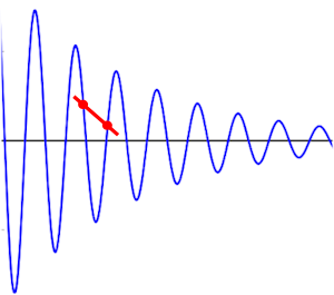 The plunger's pattern of motion creates another problem with the low sampling rate. The plunger doesn't just come to a stop when it reaches the end of its forward travel after a release. Instead, when it hits the barrel spring, it rapidly slows, and then bounces back. This makes the motion cyclical, like a classical damped oscillator. If you draw out a damped sine wave, and sample it at a low frequency relative to the oscillation frequency, you can easily contrive to pick points that appear to be forward motion, but which actually cover a full cycle of going forward and bouncing back. This is the well-known "aliasing problem" in digital sampling. You can't calculate the slope (in the case of the plunger, the speed) from these two points because they're not on the same cycle of the wave. The diagram below shows an example of this, with the two red points representing consecutive samples, and the red line representing the slope (velocity) calculated from the samples. In this example, the slope calculated is not only way off in magnitude, but also gets the direction backwards, if you're trying to interpret it as the speed at the second point in time.