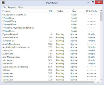 When you first install the program, you should check that the affinity settings are working. To do this, run a game in Visual Pinball, and while the game is running, go back to the PinAffinity window and check the CPU affinity column for the VP executable you're running (e.g., VPinballX.exe if you're using VP 10). If things are working, the Affinity column should show something like "-+++". If it says "Unable", it means that Windows blocked the affinity change due to privilege restrictions that apply to certain system processes. If you want PinAffinity to control those blocked processes, see Admin Mode below.