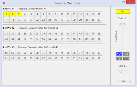 The LedWiz DLL download includes a spiffy little program for testing your LedWiz setup, called NewLedTester. This is similar to the SimpleLedTest program that a lot of people use to test their LedWiz setup, but this one is a little friendlier and more flexible, and it's 100% open source in case you want to make any customizations. It's also aware of the new "virtual LedWiz" interfaces that the DLL creates for Pinscape units with more than 32 outputs, which lets it display port numbering on the virtual units that's consistent with your Pinscape setup.